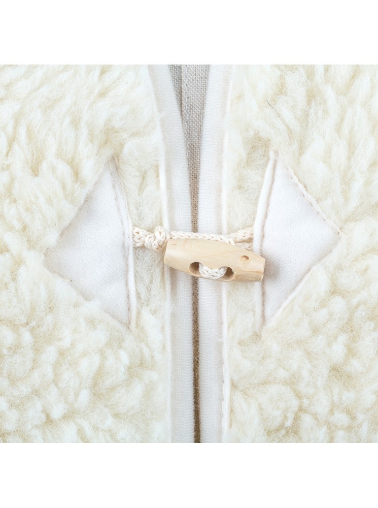 Ce gilet est entièrement en laine. Sa forme est légèrement cintrée. Sa souplesse permet de garder beaucoup de liberté de mouvement. Il se ferme à l'avant grâce à deux boutons. Il recouvre bien le bas du dos ce qui permet d'être bien au chaud.