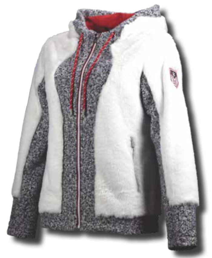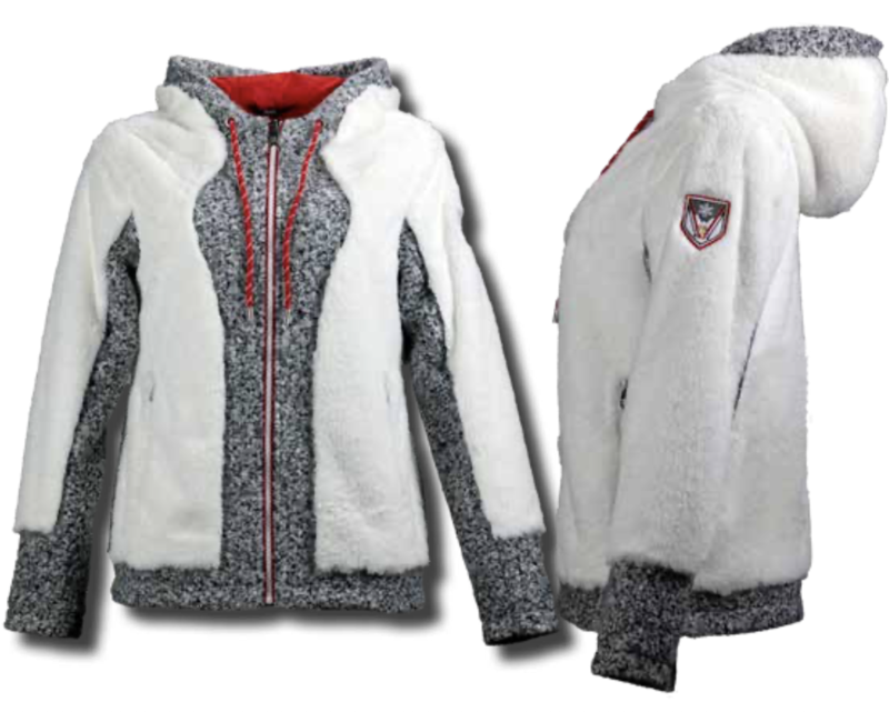 Coupe droite, fermeture par zip, deux poches zippées, entièrement doublée, capuche avec lien de serrage en coloris rouge